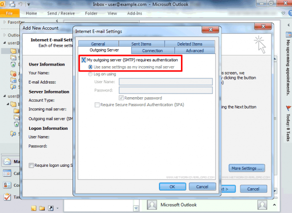 Marque as opções “Meu servidor de saída (SMTP) requer autenticação” e “Usar as mesmas configurações do servidor de entrada“;